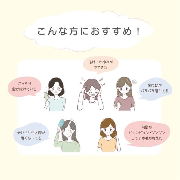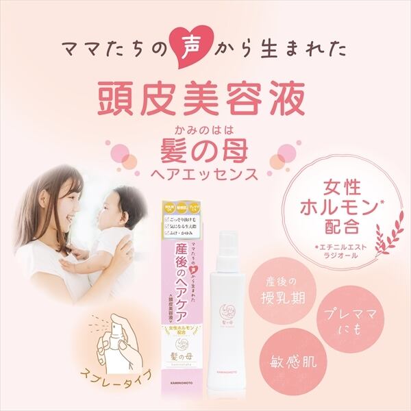 ママたちの声から生まれた頭皮美容液。女性ホルモンを含む8種の有効成分配合で抜け毛を防ぎ、ハリツヤのある健康な髪を育てます。2つの皮膚刺激性テスト済みで敏感肌の方でも安心してお使いいただけます。弱酸性で6つのフリー処方でプレママにも使用可能です。ママたちの妊娠~産後の抜け毛、髪の毛のトラブルに。